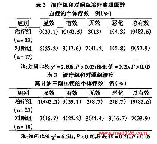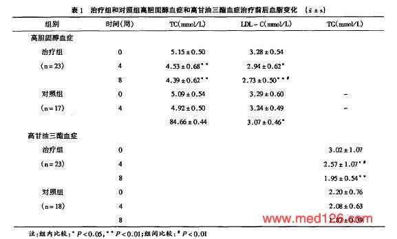 的,TC、TG、LDL-C均降低(P<0.01)。组间比较:治疗前两