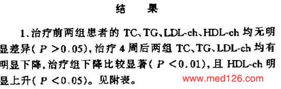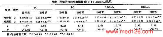 | 疗效评价标准 | 根据卫生部药物试验原则规定的调脂药物的疗效标准。①显效:TC下降≥20%,TG下降≥40%或HDL-ch升高>0.26mmol/L。②有效:TC下降l0%~20%;TG下降20%~39%或HDL-ch升高0.10~0.25mmo1/L。③无效:未达到好转标准者。 |