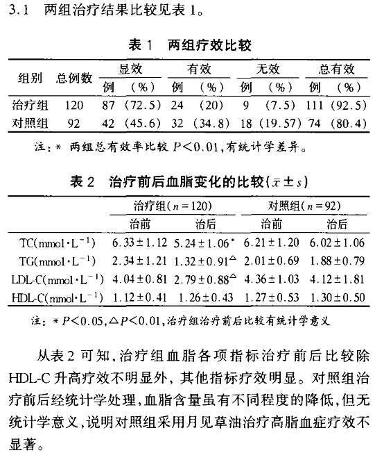 | 用法用量 | 治疗组口服降脂胶囊,3g bid;对照组口服月见草油胶丸,1.5g bid,两组均服用4周为1疗程。 |