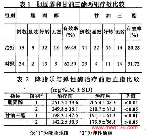 | 疗效评价标准 | 显效: 血脂降为正常或由原来的重度增高降为轻度增高,有效:血脂由原来的中度增高降为轻度增高或重度降为中度增高,无效:治疗前后血脂无改变。 |