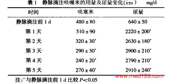 静脉滴注前l d及第l~5天呋塞米的用量和尿量变化:见表l。从表1可见,静脉滴注第2天以后所用呋噻米剂量显著少于静脉滴注前1 d的静脉注射剂量(P<0.O1),静脉滴注第l天与前l d呋塞米用量差异无统计学意义(P>O.05)。静脉滴注呋噻米时24 h尿量显著多于前l d的尿量(P![]() 静脉滴注呋噻米后血压及电解质的变化:见表2。静脉滴注呋塞米后收缩压(SBP)及舒张压(DBP)显著低于静脉滴注呋塞米前(P<0.05),静脉滴注呋塞米前后血清钾 和血清钠差异无统计学意义(P<0.05)。 ![]() 静脉滴注呋塞米5 d后病人其他方面的情况:静脉滴注呋噻米5 d后所有病人呼吸困难改善或体循环淤血明显减轻。体重较静脉滴注前明显减轻[(70±6)kg ss(65±6)kg,P |