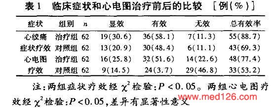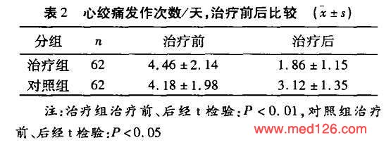 心绞痛症状疗效和心电图疗效均按1993年中华人民共和国卫生部药政局颁布的《心血管系统药物临床研究指导原则》进行评定。症状疗效判断标准显效:同等劳累程度不引起心绞痛或心绞痛发作次数减少80%以上,硝酸甘油消耗量减少80%以上。有效:心绞痛发作次数及硝酸甘油消耗量均减少50% ~80% 。无效:心绞痛发作次数及硝酸甘油消耗量均减少不到50%。加重:心绞痛发作次数、程度和持续时间加重,硝酸甘油消耗量增加。心电图疗效判定标准显效:静息心电图恢复正常,次极限量运动试验心电图由阳性转为阴性,或运动耐量上升2级。改善:静息心电图或次极限量运动试验心电图缺血性ST段下降,治疗后回升1.5mm以上,但未正常;或主要导联倒置T波变浅达50%以上,或T波由平坦转为直立,或运动耐量上升1级。无改变:静息或次极限量运动试验与治疗前基本相同。加重:静息或次极限量运动试验心电图ST段较治疗前下降≥0.5mm,主要导联倒置T波加深>150%或直立T波变为平坦,或平坦T波变为倒置,或次级限量运动试验较治疗前运动耐量下降1级。