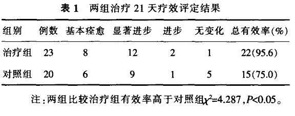 两组治疗21d神经功能缺损积分比较:治疗前,治疗组积分(24±6),对照组积分(24±8);治疗后,治疗组积分(9.5±6),对照组积分(15.5±4)。治疗前两组平均积分差异统计学上无显著意义(P>0.05),治疗后两组积分减少,但治疗组减少幅度大,明显优于对照组(P<0.05)。