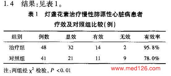 | 用法用量 | 对照组给予常规基础治疗,包括合理的氧疗、有效抗生素控制感染、祛痰、平喘、支气管扩张剂改善通气、纠正电解质及酸碱平衡紊乱、洋地黄及利尿剂的应用等。治疗组在常规治疗的基础上加用灯盏花素50mg 5%G-S 250ml或N-S 250ml静滴,两组疗程均为21d。 |
