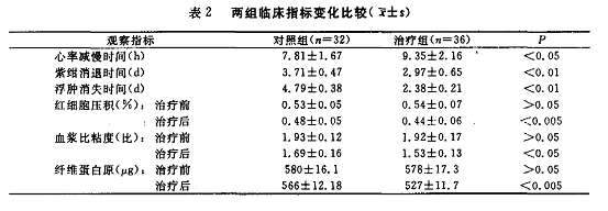 | 疗效评价标准 | 依据1997年全国第2次肺心病专业会议制定疗效评定标准对两组进行疗效判定。比较两组治疗前后心功能显效率、心率减慢时间、紫绀消退时间、浮肿消失时间、红细胞压积、血浆比粘度及纤维蛋白原变化。 |