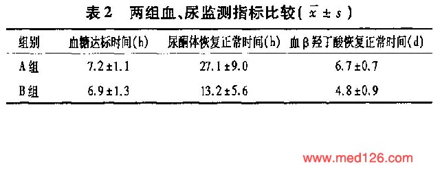 两组患者在年龄、BMI、入院时血糖值差异无统计学意义,具有可比性(见表1)![]() 。两组血、尿监测指标比较见表2 ![]() 。两组血糖达标时间差异无统计学意义(P>0.05)。尿酮体与血β-羟丁酸恢复正常所需时间A组(对照组)比B组(治疗组)长,差异有统计学意义(P<0.05或P<0.01)。 |