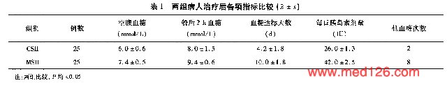两组病人空腹血糖、餐后2小时血糖、低血糖发生次数、血糖达标天数、胰岛素用量比较见表1![]() 。表明CSⅡ组比MSⅡ组血糖控制更理想,血糖达标天数缩短,低血糖发生次数少,差异均有统计学意义,心肌梗死和脑梗死的预后明显较好。 |