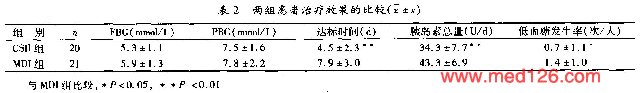 临床情况比较:两组间年龄、性别、体重指数、治疗前FBG、PBG及HbAlc均无显著性差异(P>0.05),见表1![]() 。胰岛素用量及血糖达标时间比较:两组患者治疗后FBG、PBG均得到良好控制。其中治疗组(CSⅡ组)较对照组(MDI组)胰岛素用量明显减少(P<0.05),且显著缩短了达标时间(P<0.01),见表2 ![]() 。低血糖发生率比较:CSⅡ组与MDI组相比,低血糖发生率显著减少(P<0.05),见表2。 |