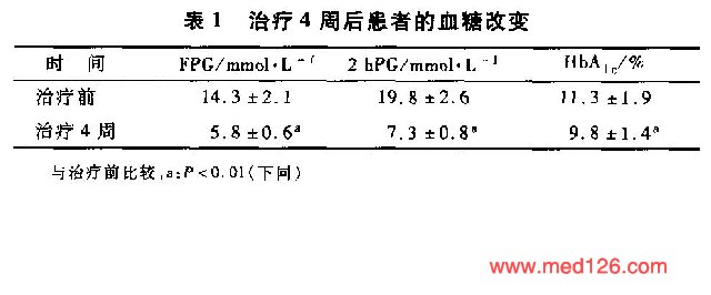 | 疗效评价标准 | FPG控制在4.0~7.0mmol·L-1,2hPG控制在4.5~8.0mmol·L-1。 |