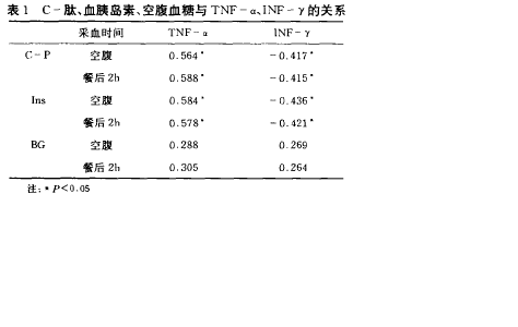1.C-肽(C-P)、胰岛素(Ins)、空腹血糖(BG)与INF-γ、TNF-α的关系,TNF—a水平下降,C-P,胰岛素水平亦下降,与C-P、胰岛素水平的下降呈正相关;INF-γ水平升高,而c-肽、胰岛素的水平下降,其水平的升高与C-肽和胰岛素水平呈负相关。血糖水平的变化与二者水平的变化均元明显相关。见表1。![]() 2.观察组与对照组相比,TNF-α显著降低,INF-γ显著升高;经强化胰岛素治疗后TNF-α较治疗前明显升高,INF-γ较治疗前显著降低。 |