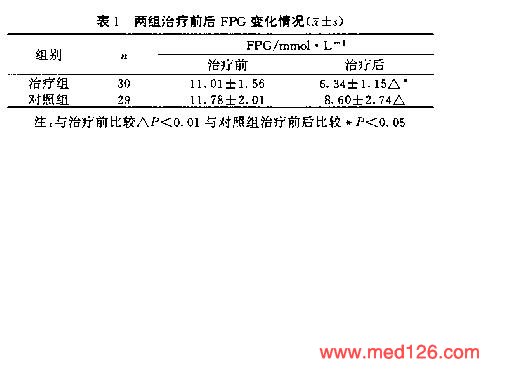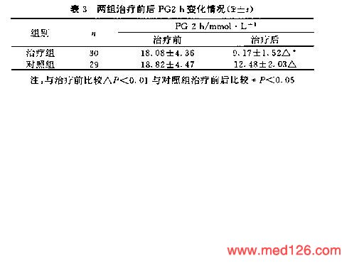 | 疗效评价标准 | 观察指标:空腹血糖(FPG)、餐后1小时血糖(PG1h)、餐后2小时血糖(PG2h)。 统计学处理:数据以均数±标准差(x±s),表示,用t检验。 |