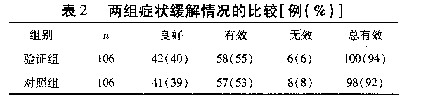 (1)空腹血糖:两组药物降糖效果的比较如表1![]() 。从表1中可以看出,服用糖平胶囊的降糖效果略优于消渴丸(P<0.05)。(2)症状分为两组:多食易饥、消瘦、乏力为一组,炊渴多饮、尿多为另一组。两组症状均消失为良好,一组症状消失为有效,两组均有两项消失者亦为有效,其余为无效。两组症状缓解情况的比较见表2 ![]() 。两组症状均在4 w 时明显改善,8 w 时达高峰,12 w呈稳定状态,与血糖下降不呈平行关 |