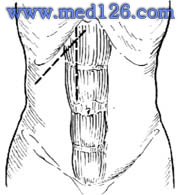 2.切口 一般取右上经腹直肌切口;或右上正中旁切口;肥胖和肋弓较宽的病人,可采用右肋缘下斜切口[图1 ⑴]。
