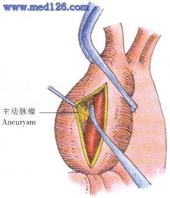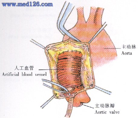 (3)如动脉瘤的近心端距主动脉瓣环3cm以远时,可在切除瘤体后,单纯行人工血管移植术(图6)。