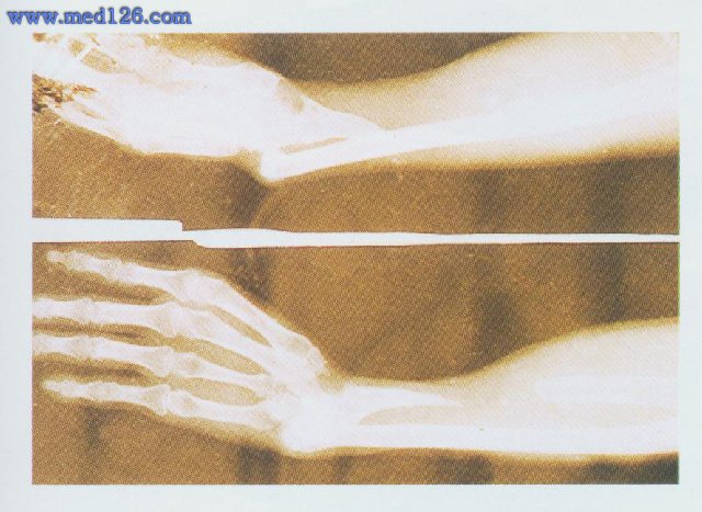 切除前臂,显露桡骨两断端,修整骨残端(图6)。