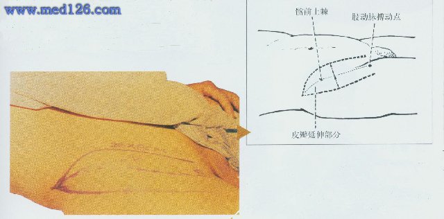 面:沿线的上下各4cm为皮瓣宽度,向近端适当延伸为皮瓣长度(图3)。