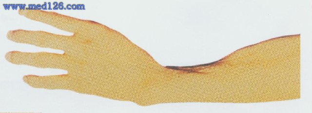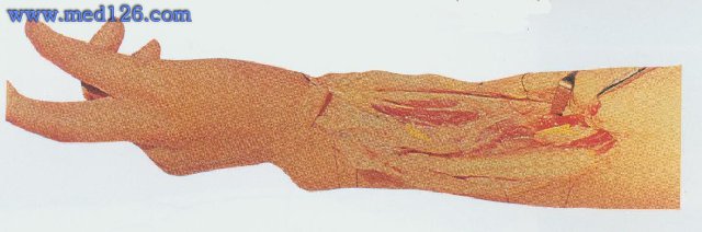 前臂皮肤及部分桡骨陈旧性缺损(图1)。
