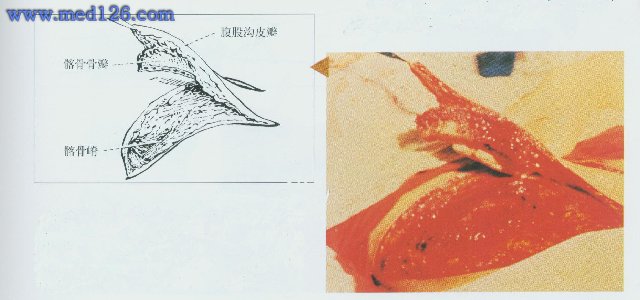 按设计切开皮瓣,蒂部皮肤不切开,从深筋膜层掀起皮瓣,将旋髂浅动、静脉包括在皮瓣内。在皮瓣深面适当部位,自髂骨嵴上切取骨瓣。注意,勿使皮瓣与骨瓣分离(图4)。