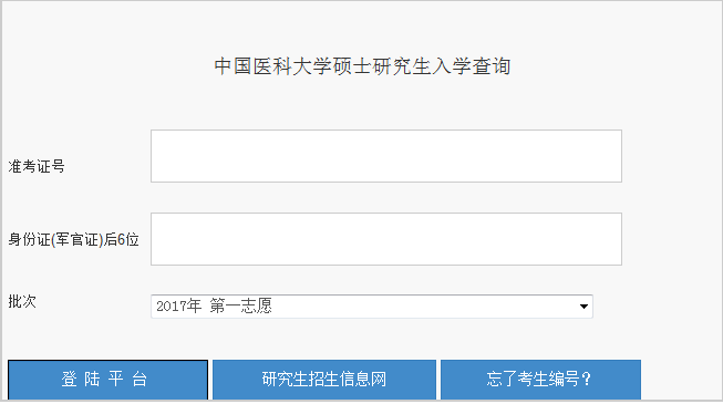 现发布我校2017年硕士研究生入学考试成绩。考生可凭借本人考生编号及证件号码后6位登录系统进行成绩查询及提交成绩复核申请,网址http://graduate.cmu.edu.cn/zsxc.asp。