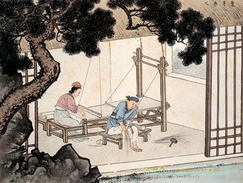 董永,相传为东汉时期千乘(今山东高青县北)人,少年丧母,因避兵乱迁居安陆(今属湖北)。其后父亲亡故,董永卖身至一富家为奴,换取丧葬费用。上工路上,于槐荫下遇一女子,自言无家可归,二人结为夫妇。女子以一月时间织成三百匹锦缎,为董永抵债赎身,返家途中,行至槐荫,女子告诉董永:自己是天帝之女,奉命帮助董永还债。言毕凌空而去。因此,槐荫改名为孝感。