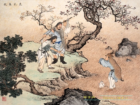 郯子,春秋时期人。父母年老,患眼疾,需饮鹿乳疗治。他便披鹿皮进入深山,钻进鹿群中,挤取鹿乳,供奉双亲。一次取乳时,看见猎人正要射杀一只麂鹿,郯子急忙掀起鹿皮现身走出,将挤取鹿乳为双亲医病的实情告知猎人,猎人敬他孝顺,以鹿乳相赠,护送他出山。
