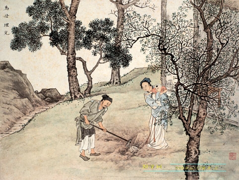 郭巨,晋代隆虑(今河南林县)人,一说河内温县(今河南温县西南)人,原本家道殷实。父亲死后,他把家产分作两份,给了两个弟弟,自己独取母亲供养,对母极孝。后家境逐渐贫困,妻子生一男孩,郭巨担心,养这个孩子,必然影响供养母亲,遂和妻子商议:“儿子可以再有,母亲死了不能复活,不如埋掉儿子,节省些粮食供养母亲。”当他们挖坑时,在地下二尺处忽见一坛黄金,上书“天赐郭巨,官不得取,民不得夺”。夫妻得到黄金,回家孝敬母亲,并得以兼养孩子。