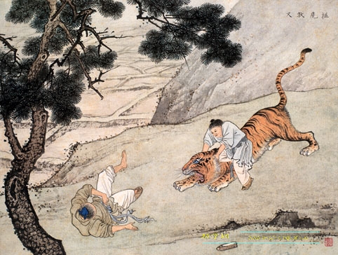 杨香,晋朝人。十四岁时随父亲到田间割稻,忽然跑来一只猛虎,把父亲扑倒叼走,杨香手无寸铁,为救父亲,全然不顾自己的安危,急忙跳上前,用尽全身气力扼住猛虎的咽喉。猛虎终于放下父亲跑掉了