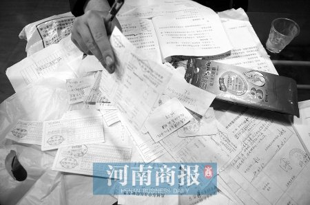 胡二军把各种证明单据、车票、住院的发票摆满了一桌子商报记者 丁洁/摄