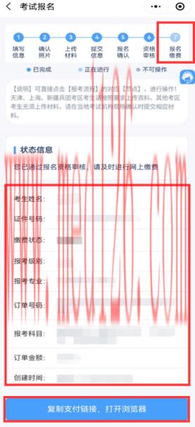 (二)点击报考流程上的“缴费”节点或左侧【网上缴费】,核对报考专业科目和金额,确认无误后点击“支付”跳转至考区指定的缴费平台。
