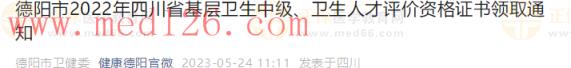 健康德阳官微发布德阳市2022年四川省基层卫生中级、卫生人才评价资格证书领取通知,医学全在线整理具体内容如下: