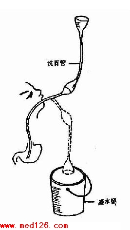 操作方法:①备齐用物携至病人床边,向其说明解释,消除顾虑,以取得合作。②病人取坐位、半坐卧位或仰卧位,戴好橡胶围裙,如有活动假牙应取出,盛水桶放头部床下,置弯盘于病人口角处。③用润滑油润滑胃管前端后,自鼻腔或口腔插入[方法同鼻饲法(3)].④证实胃管在胃内后,用注洗器抽尽胃内容物(必要时留取标本),再注入洗胃液约200ml,抽出弃去,如此反复冲洗,直至洗净为止。⑤冲洗完毕后,拔管(方法同漏斗胃管洗胃法⑥)。医学全在.线www.lindalemus.com