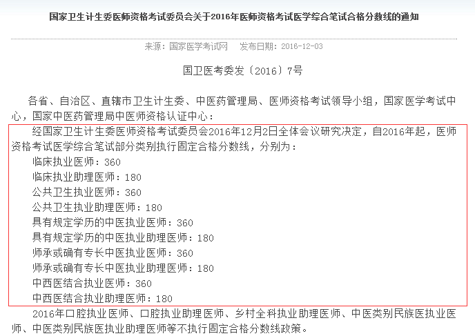 附官方通知2016年执业和助理医师笔试考试分数线: