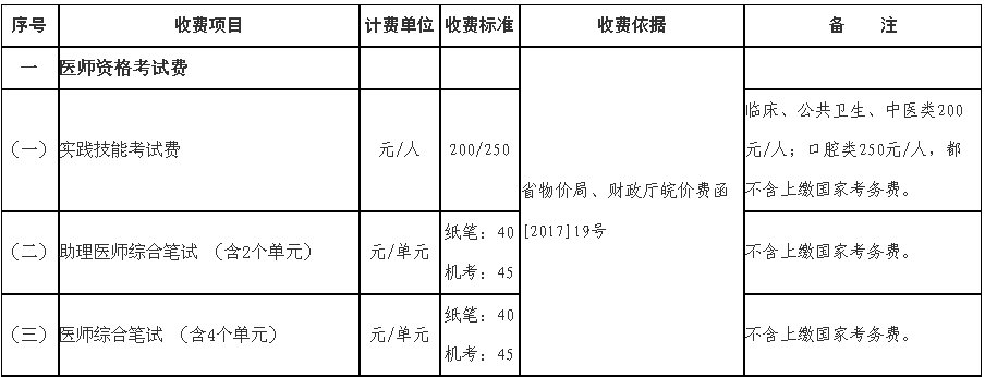 根据安徽省物价局发布公告,2018年医师资格考试收费标准如下: