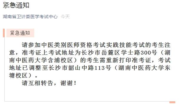 请参加中医类别医师资格考试实践技能考试的考生注意,准考证上考试地址为长沙市岳麓区学士路300号(湖南中医药大学含浦校区)的考生需重新打印准考证,考试地址已调整至长沙市韶山中路113号(湖南中医药大学东塘校区)。
