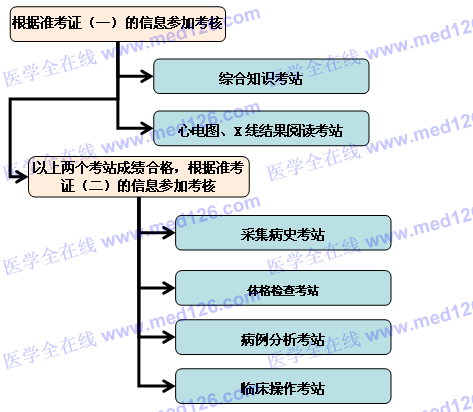 采用客观结构式临床考核(OSCE)的方式,分为临床思维考核和临床操作技能考核两部分,下设综合知识、心电图及X线结果判读医学.全.在.线.提供. www.lindalemus.com、病史采集、体格检查、病例分析、临床操作六个考站。各考站的具体规定如下表所示。