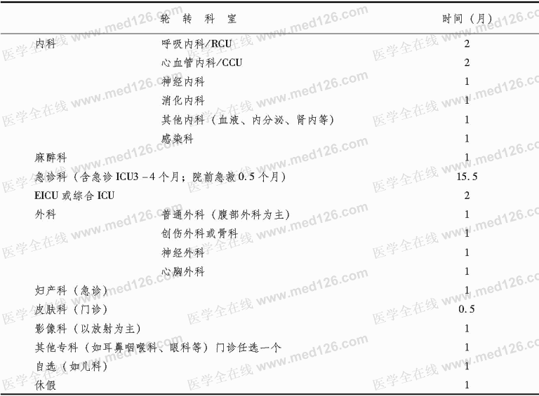 临床科室轮转总体安排为:急诊科(含急诊ICU)轮转时间为15.5个月,其他急诊医学相关学科轮转18.5个月,自选轮转(或机动)1个月,休假1个月。详细安排如下: