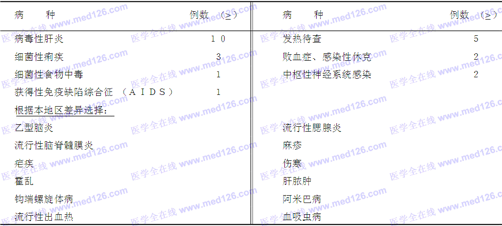 掌握:病毒性肝炎的病原学知识、临床表现、诊断依据、鉴别诊断及治疗;慢性乙型肝炎和丙型肝炎的抗病毒治疗;重型肝炎的诊断和治疗;伤寒、菌痢、阿米巴病、细菌性食物中毒等肠道传染病传播途径的共同性、诊断依据、鉴别诊断及特异治疗;脓毒血症与感染性休克的发病机制及抗休克治疗;抗菌药物的选择、进展及临床应用;寄生虫病的治疗;不明原因发热的诊断与鉴别诊断;获得性免疫缺陷综合征(AIDS,艾滋病)的病原学知识、临床表现、诊断依据、鉴别诊断及治疗医学全在线www.lindalemus.com;消毒隔离的程序。