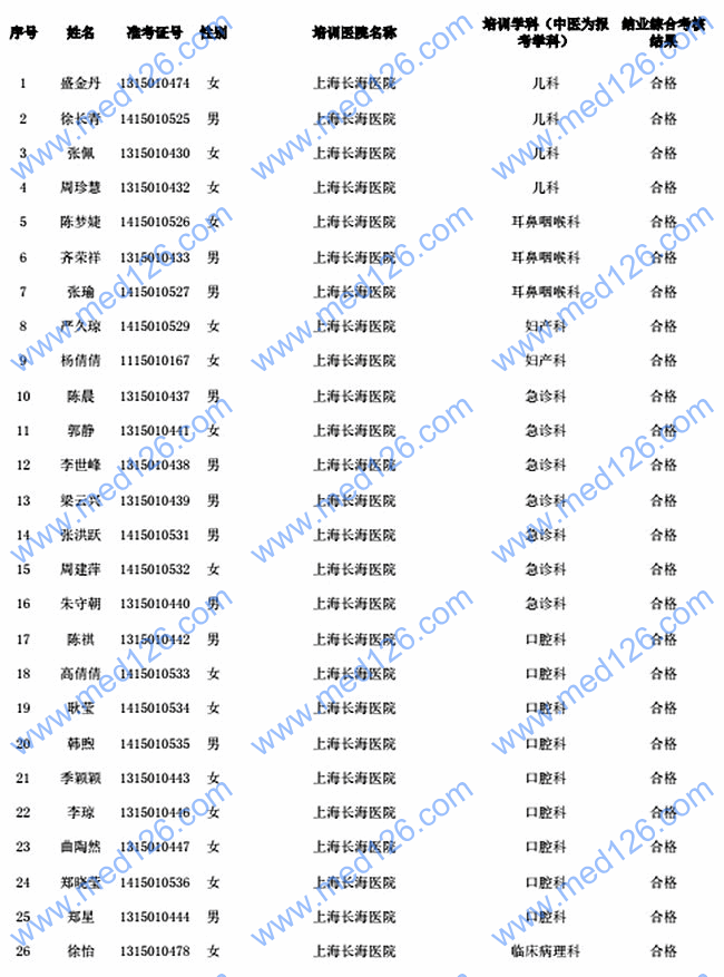 2016年上海市住院医师规范化结业综合考核合格人员名单